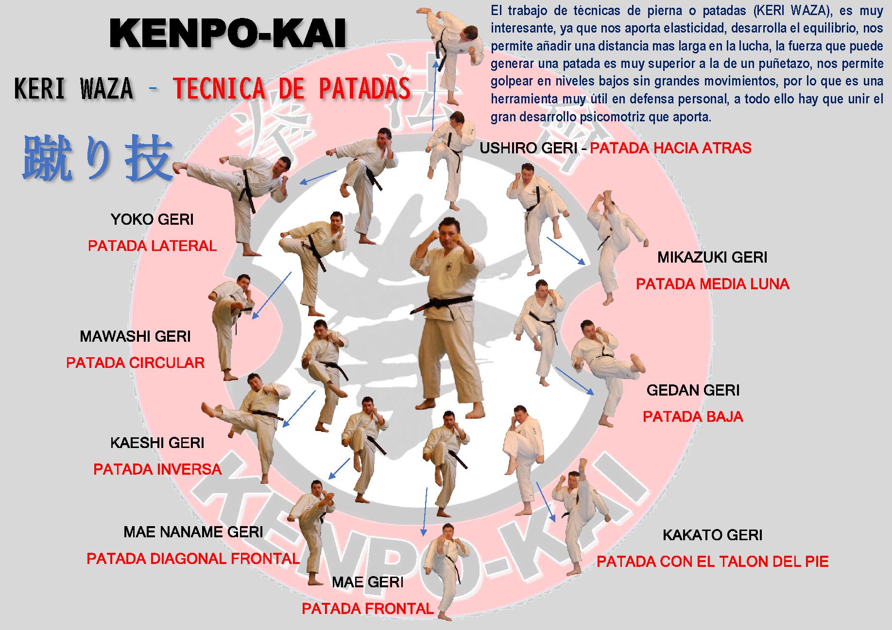 El sistema de patadas (KERIHO) o técnicas de patada (KERI WAZA) son esenciales en el Kenpo-Kai.  Su estudio es tan importante como las técnicas de puño o codo.