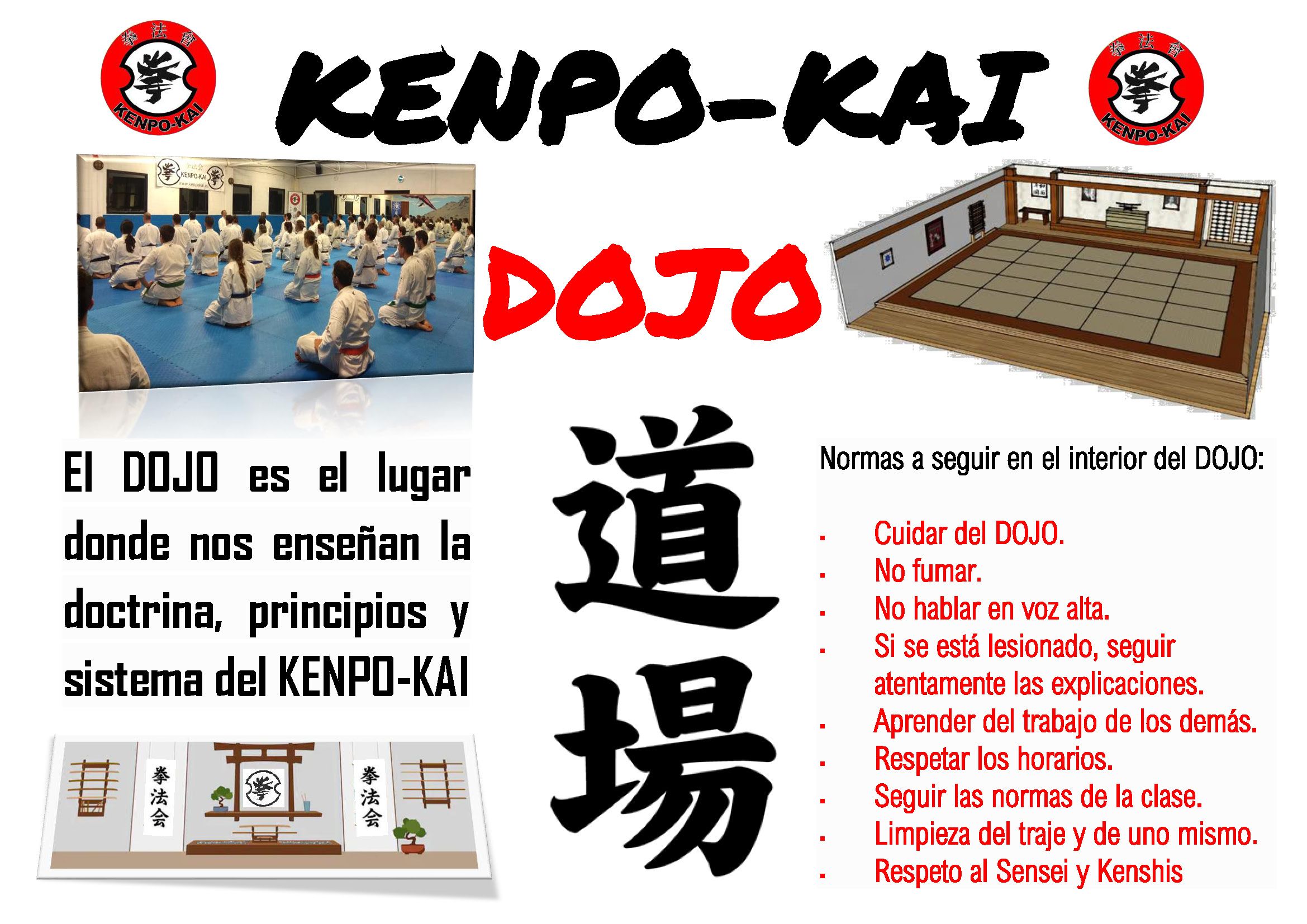 El DOJO se podría decir que es un lugar donde nos enseñan la doctrina, principios y sistema del KENPO KAI donde se encuentran los discípulos que siguen y practican este ARTE.